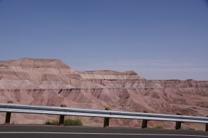 Straight after morning tea we began our journey from the Grand Canyon out to Monument Valley (in the top right hand corner of Arizona). From Cameron we turned north towards Page and began the journey driving along western edge of the Painted Desert. The desert certainly lives up to its name! The hills on the right hand side of the car were all sorts of colours (reds, pinks, oranges, yellows, pale blues, greens, greys.. all sorts of colours!). It puts the artists palate (in Death Valley) to shame as these hills just go on and on and on.. Probably a good 70 miles! Basically, the whole drive from Cameron to Page we had an escarpment on the right hand side of the car that represented every colour imaginable! It is so beautiful that after awhile you start to get a bit numb to the sites and think ‘here’s another coloured hill!’.