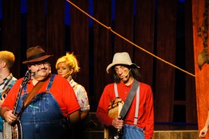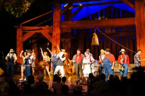 The show itself opened with members of the cast playing music (whilst we finished dinner) and some gags about the food etc. The show itself was the story of the new sheriff in town who has rented a barn from the mayor. The mayor has stipulated that if any damage occurs to the barn the sheriff must pay up $1000 to pay for repairs. The new sheriff is staged as a real ‘country bumpkin’ who stupidly agrees to have a barn warming party and is told by the mayor to invite the two influential families, the Hatfield’s and the McCoy’s, of the area to his party. The mayor does this knowing that the two families will immediately start fighting and trash the barn. Of course, the story continues, the barn is trashed (with plenty of sore heads on both sides) and the new sheriff has to pay up the cash. Meanwhile we find out that Ma McCoy and Pa Hatfield used to have a budding relationship and that their romance is at the heart of the feud, we also find out that they both owe money on their farms and the mayor is calling in the debts. So we have three groups who all need a $1000.. it just so happens that the town is holding its annual talent contest and the prize is surprise, surprise a $1000… The end of the tale is both families join sides to win the money and Ma and Pa live happily ever after. The story line was pretty lame, but the actual music (blue grass of course) and the comedic interludes made it a really great night out and well worth the entry price.