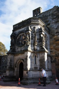 The other interesting thing in the chapel is that there is supposed to be a tune carved into hundreds of little boxes that adorn the roof of the Lady Chapel. Apparently, if you ‘crack the code’ to the boxes you can learn the tune and then if it is played on a certain day, at a certain time, with the right instruments the mysteries of Roslyn will all be revealed. Supposedly a couple of guys ‘cracked the code’ a few years ago and the tune was played by a medieval music group but unfortunately no secrets were revealed…. So either they haven’t cracked the code or they played the music on the wrong day or at the wrong time or……….. its just a load of hog wash! Regardless, it’s a good story and it could be some sort of musical tune (because each row of “music boxes” also has an accompanying figurine that are all playing different looking instruments) so who knows??